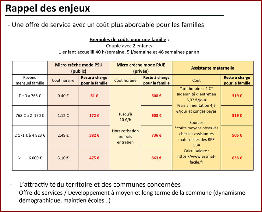 Pour info, voici par comparaison le reste à charge pour les familles selon le mode de garde et selon le revenu mensuel des familles :